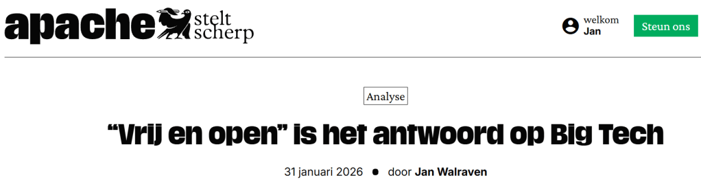 Wat Apache scherp benoemt, is dat “technologische soevereiniteit” vandaag vaak gereduceerd wordt tot een slogan. Alsof je dat bereikt door een Europese variant van Google, Microsoft of Amazon te bouwen. Alsof het probleem Amerika is en niet het Big-Tech-model zelf: gesloten ecosystemen, lock-in, extractie van data en macht, en een informationele asymmetrie die haaks staat op democratische controle.