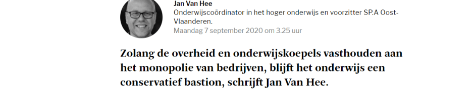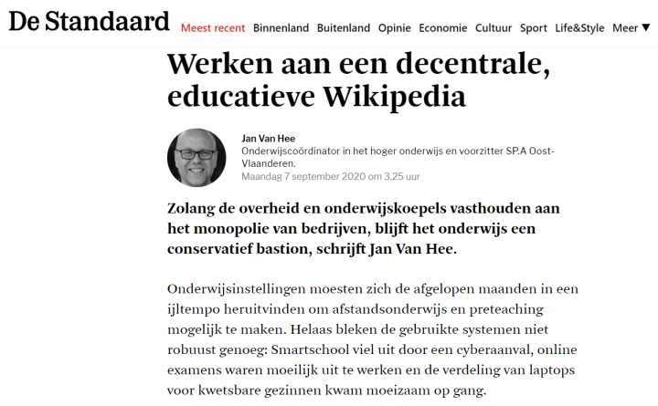 In 2020 verscheen mijn opiniestuk in De Standaard over het gebruik van dure en lui-makende schoolboeken in het onderwijs en mijn voorstel om de expertise van alle leerkrachten te bundelen in één “educatieve wikipedia”.