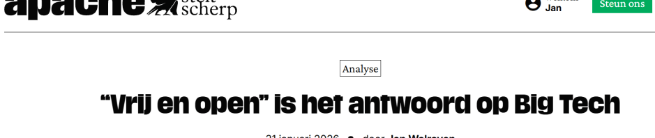 Wat Apache scherp benoemt, is dat “technologische soevereiniteit” vandaag vaak gereduceerd wordt tot een slogan. Alsof je dat bereikt door een Europese variant van Google, Microsoft of Amazon te bouwen. Alsof het probleem Amerika is en niet het Big-Tech-model zelf: gesloten ecosystemen, lock-in, extractie van data en macht, en een informationele asymmetrie die haaks staat op democratische controle.